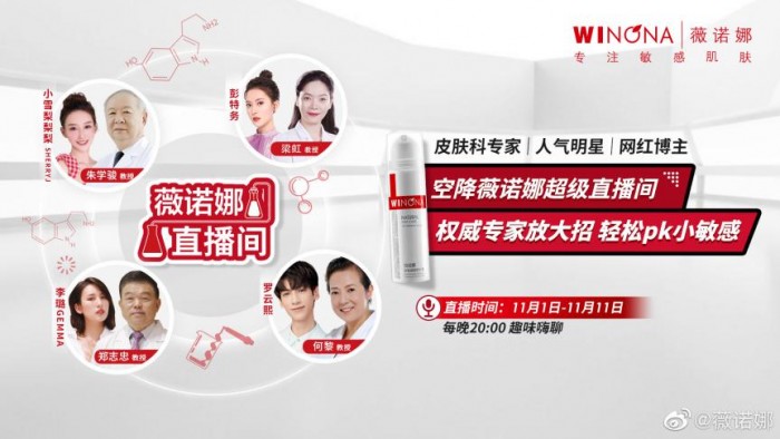 专注敏感肌肤的功能性品牌薇诺娜,此次还邀请了中国皮肤科著名医生专家何黎、梁虹、朱学骏、郑志忠、温海教授等,组成“医生天团”跨界知名演员罗云熙、美妆护肤意见领袖“小雪梨梨梨”、“李璐GEMMA”、“彭特务”进行线上直播,与目标受众交互答疑解惑,为敏感肌肤人群提供专业、精准的护肤解决方案,专业加持深孚众望,专业背书高能渗透。同时薇诺娜线上各渠道自播多触点引爆,薇诺娜“专注敏感肌肤护理的功能性品牌”形象定位深入人心,实现短链路营销闭环,促进薇诺娜品牌势能集束式爆发。