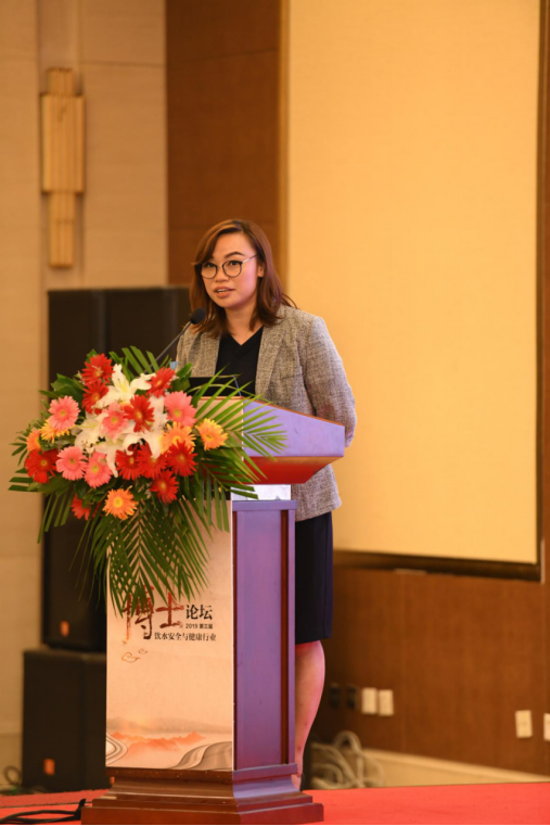 深圳安吉尔饮水产业集团有限公司技术研发主任/高级工程师雷晶发表主题演讲《荷电材料在饮用水净化中的应用研究》。她介绍了安吉尔最近的工作——一种新型的荷电材料在饮用水净化中的应用研究。