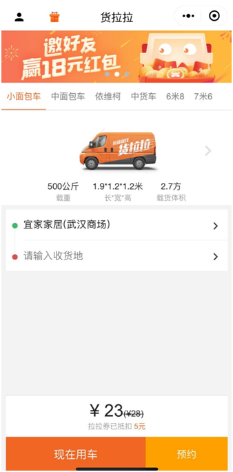 进入小程序首页后,即可选择 “现在用车”或“预约”的用车方式;在车型方面,可以有中货,中面等多种车型可供选择;支付结算方面,可选择“微信支付”或者“现金支付”,并且可以选择拉拉券优惠。支付完成后即时接单,在订单完成后还可以对本次用车进行评价。