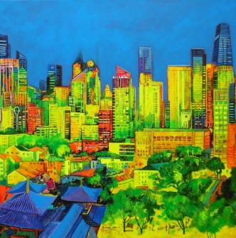 此幅作品捕捉了唐人街古典建筑物与周边现代化建筑之间相互交融的情景,场景被柠檬黄彻底点亮,毫不违和。唐人街的园林绿化给人一种不加修饰的自然美感,暗示着对古典建筑的保护,阻隔不断兴建的现代建筑的强行入侵。乌皮安诺说他总是在寻找别具一格的表达方式揭示人类的进步,建筑物就是很好的一种论证。