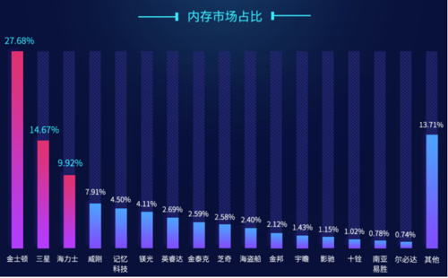 结合本次内存市场占比来看,金士顿占据了近27.68%的内存市场,第二名三星尽管是笔记本内存的“大哥”,也只有14.67%的份额。金士顿的在内存价格高涨时的压价策略不仅为自己快速站稳了市场,而且还赚取了用户的口碑和信任。